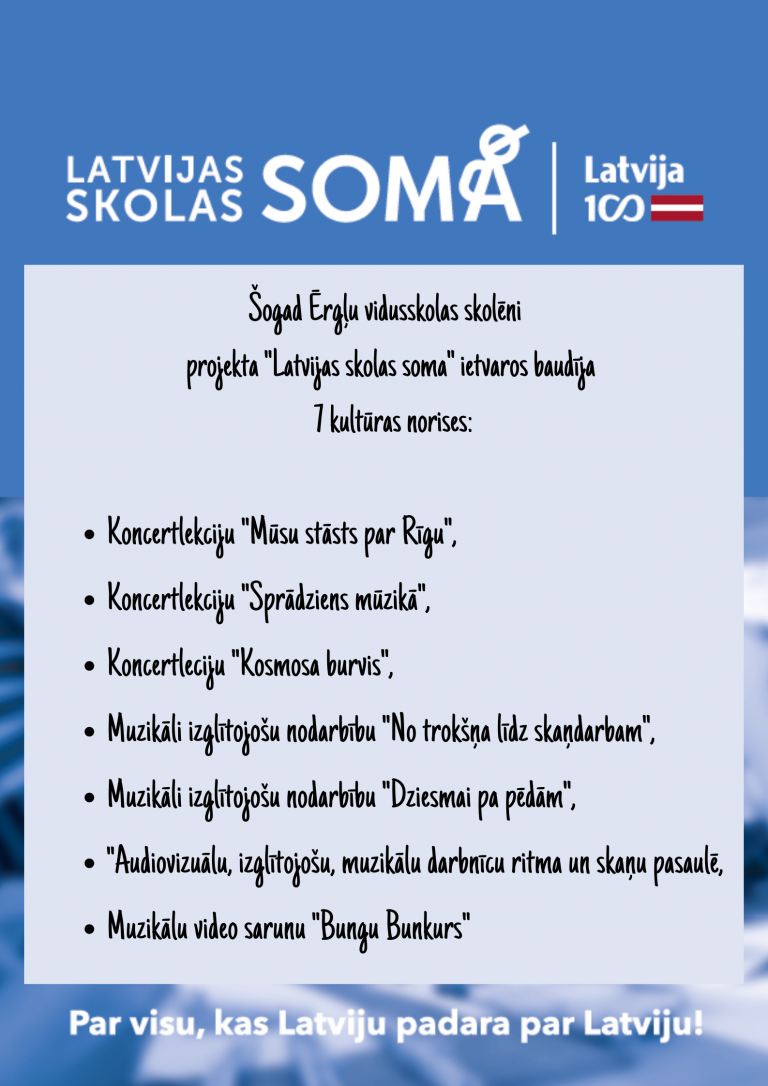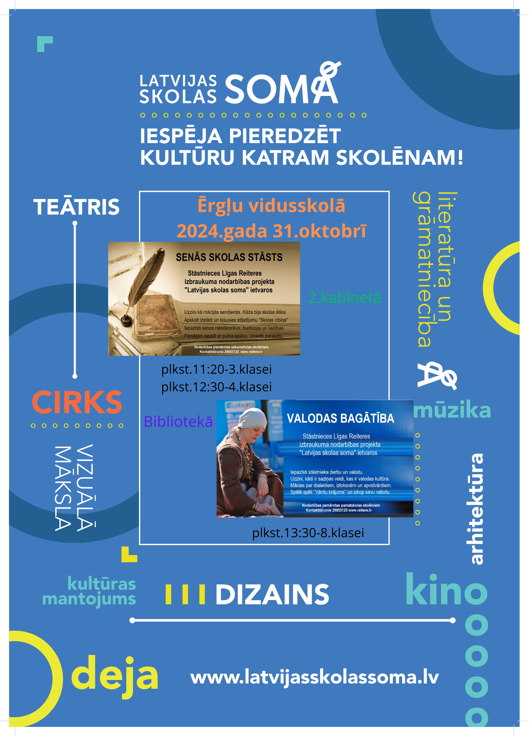 Ērgļu vidusskolā 29. novembrī pie 1.-4. klases skolēniem programmas “Latvijas skolas soma” ietvaros viesojās Operetes teātris . Skolēniem tika piedāvāts aizraujoši izzinošs 360° 3D videoceļojums virtuālajā realitātē. Šī bija unikāli veidota operetes izrāde, kas skatāma ar virtuālās realitātes 3D brillēm, skatītājam virtuāli nokļūstot uz VEF kultūras pils skatuves, zālē vai aizkulisēs, piedzīvojot reālas klātbūtnes efektu.